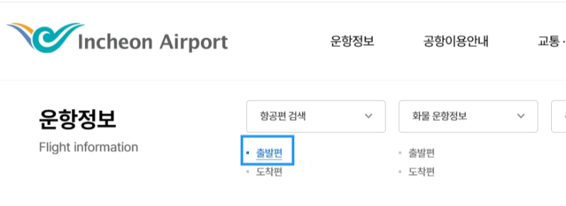 인천공항 홈페이지나 모바일 앱 들어가서 '출발편' 누르면 된다.